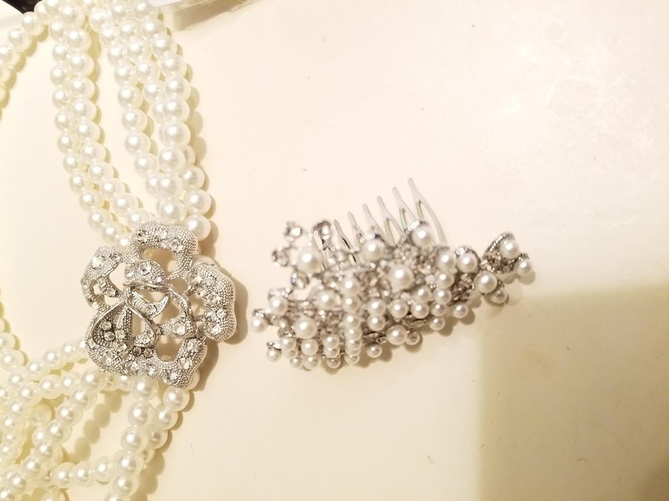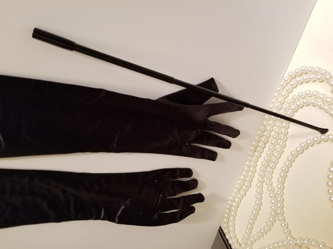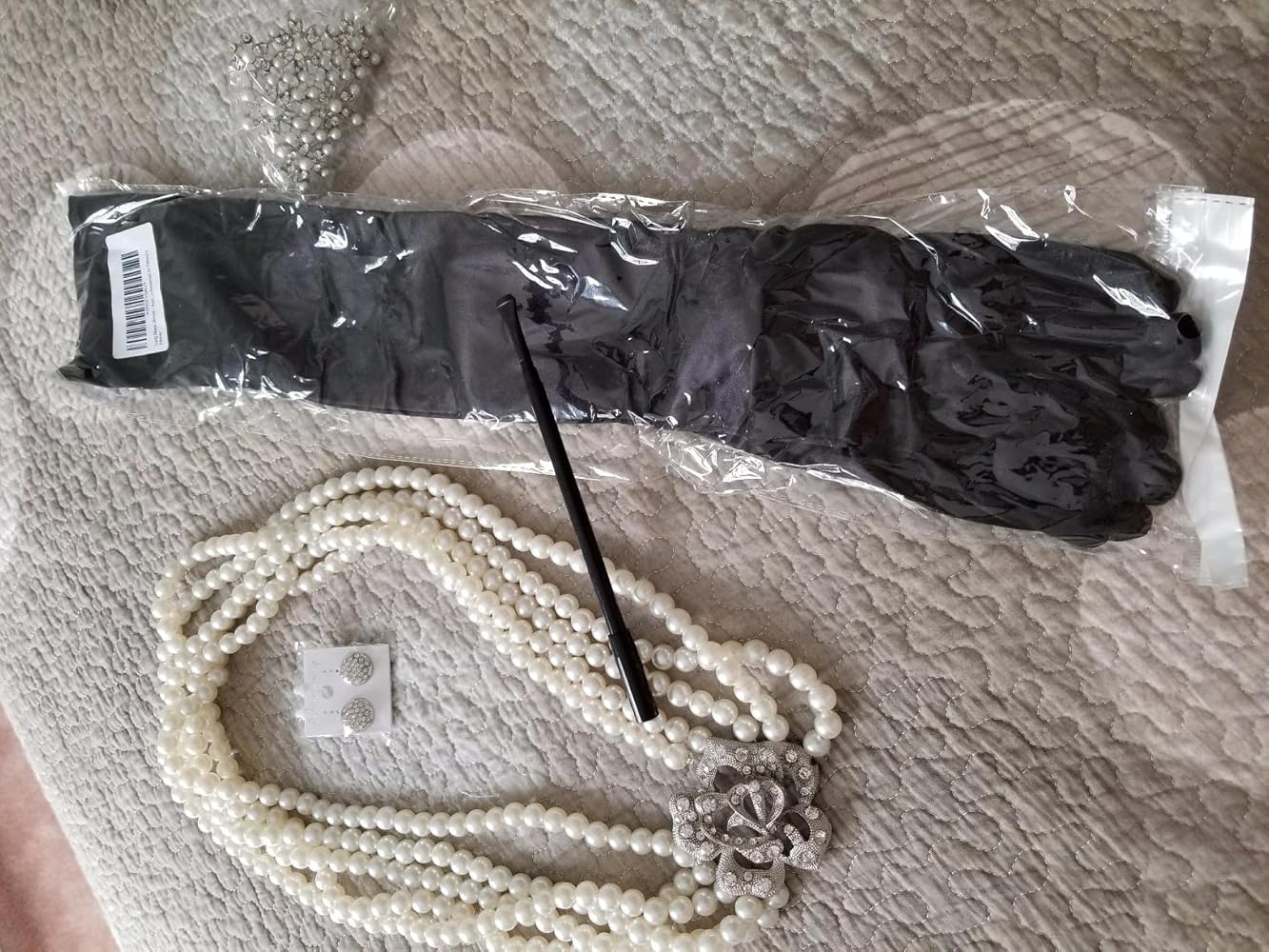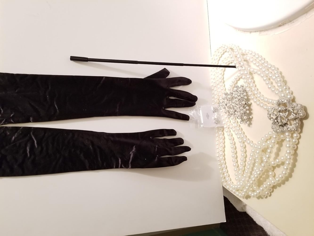 These accessories were just as described. I’m very happy with my purchase. It shipped quickly (I have Prime). It was packaged very well. They are of decent quality, especially the necklace. I have fat arms and the gloves fit comfortably and reach past the elbows. The tiara has combs so it can securely sit on your head. The only downside (and maybe not for some) is the earrings are clip-on’s but that’s not a really big deal. The cigarette holder is real and extends. Overall. The pieces look very realistic.