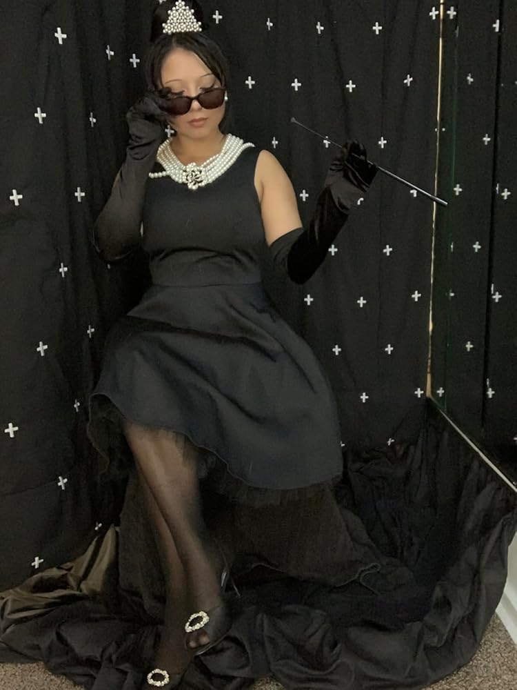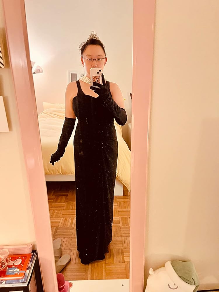 This would have been perfect to go along with my Holly Golightly getup, but I ended up returning the dress from Amazon I was going to use it with; therefore, I also returned the accessories. I did not fit the gloves nor did I try the neclace, but I can the accessories are very well made. The necklace had weight, and the crown was absolutely beautiful!I will def purchase if I ever dress up as Audrey.