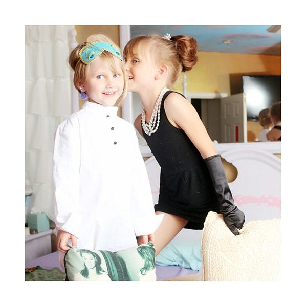 We developed this set especially for the mini Holly Golightlys in the world who are inspired to give us their own rendition of Audrey’s iconic role this season. The Audrey jewelry set is made as a child sized version of the original accessories kit that completes our iconic Holly Golightly black dress costume. In addition to making everything smaller, we also made sure the clip on earrings are extra padded for your little angel’s comfort.